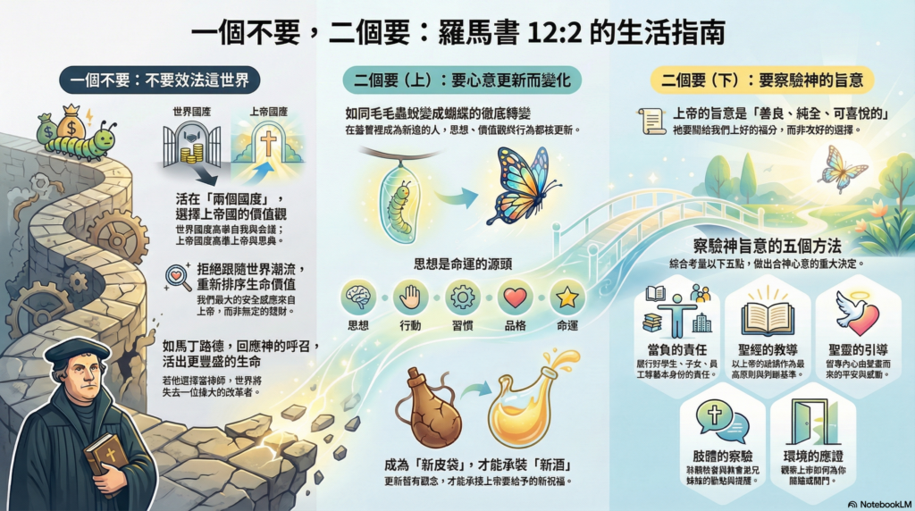 保羅提醒我們,不要效法這個世界,效法的意思是模仿、跟隨世界潮流、被環境塑造。保羅勸勉我們不要被這個世界的價值觀、潮流影響,信徒在基督裡有新的身分,新的價值觀,新的生活。